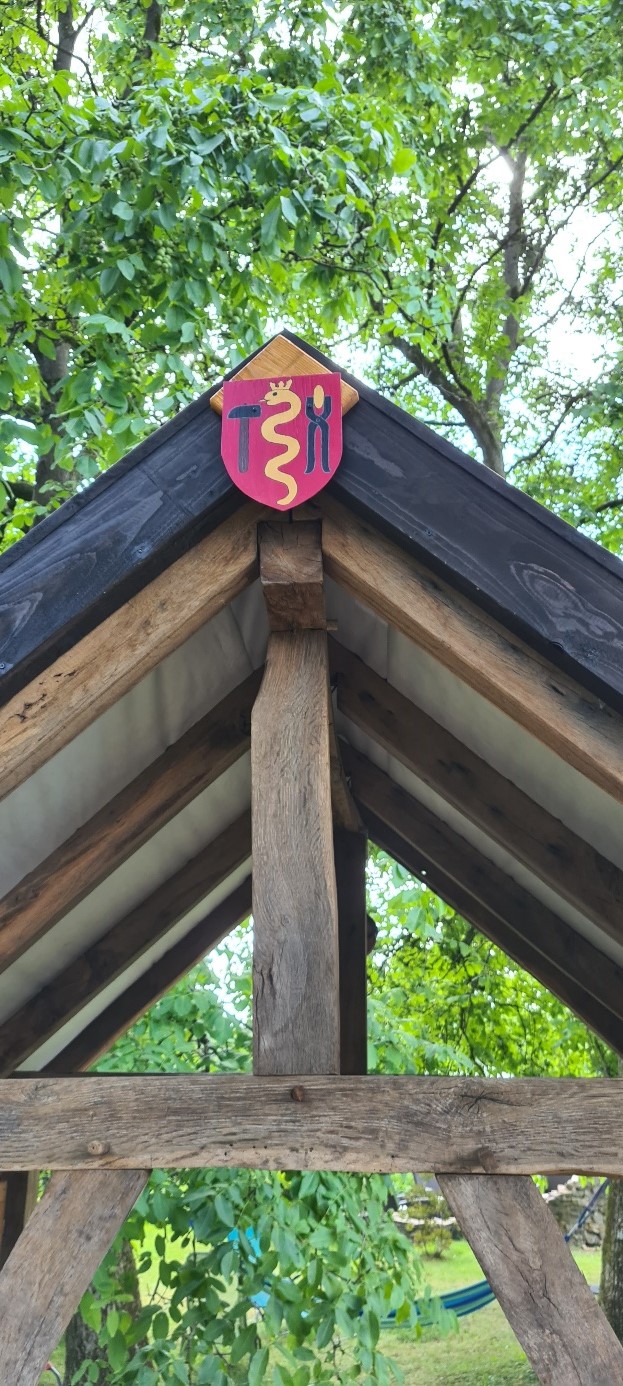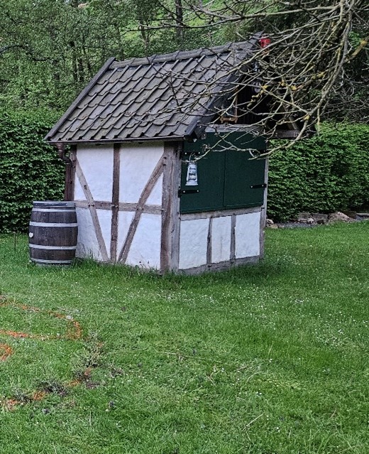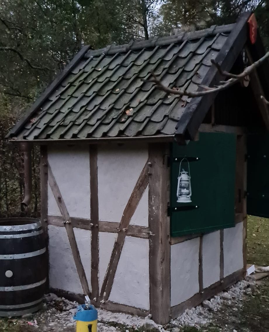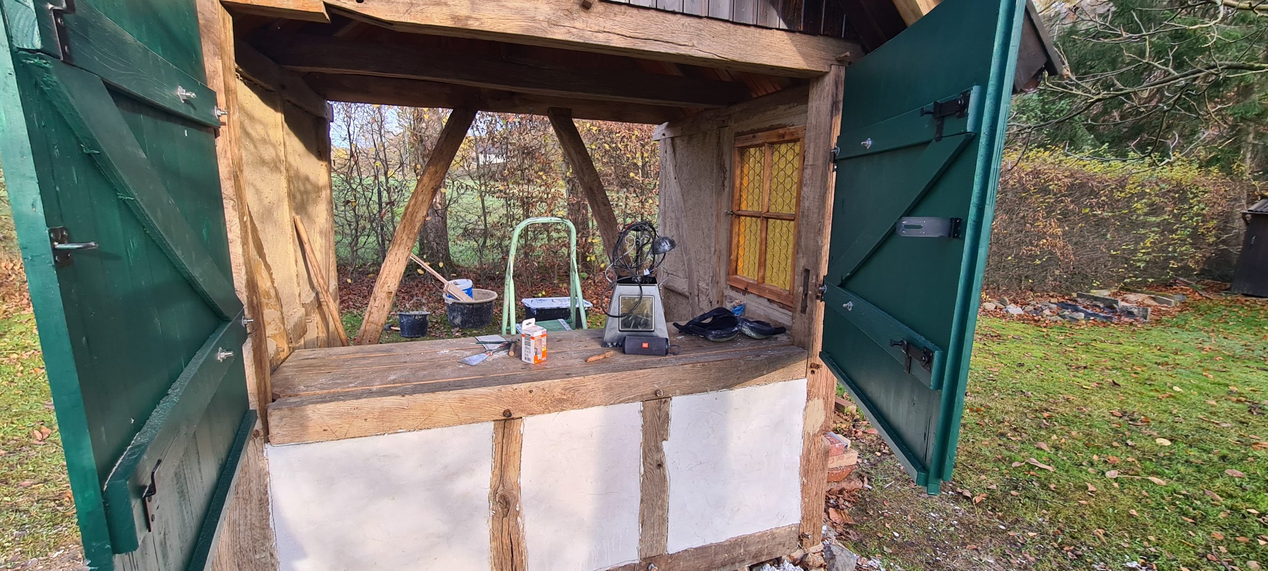 Der Bau der Schmiede war ein wahres Herzensprojekt, bei dem es auf jedes Detail ankam. Das alte Zunftwappen, das Aesopschlange, Zange, Hammer und Gold zeigt, wurde von Hand gemalt und verleiht der Schmiede einen traditionellen Charakter. Die Schlagläden und Türen, die im typischen Bergisch Grün lackiert wurden, runden das Gesamtbild ab.