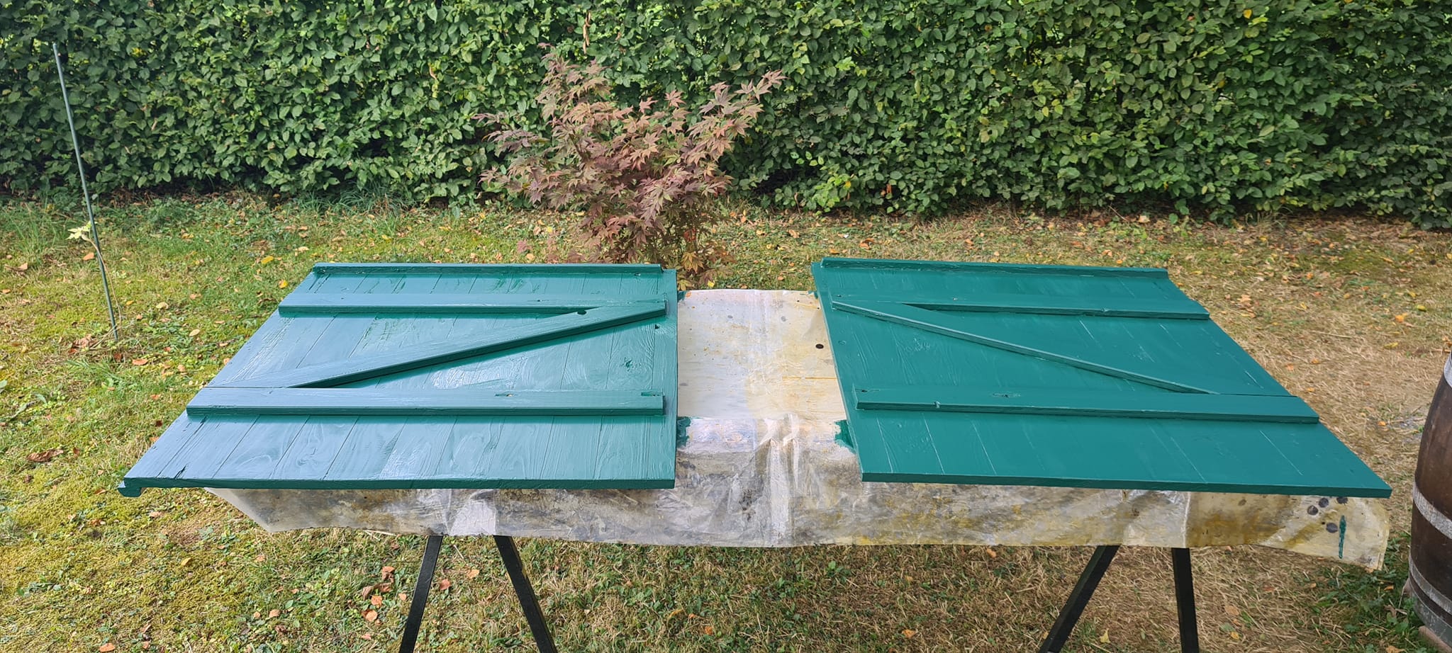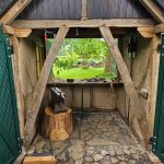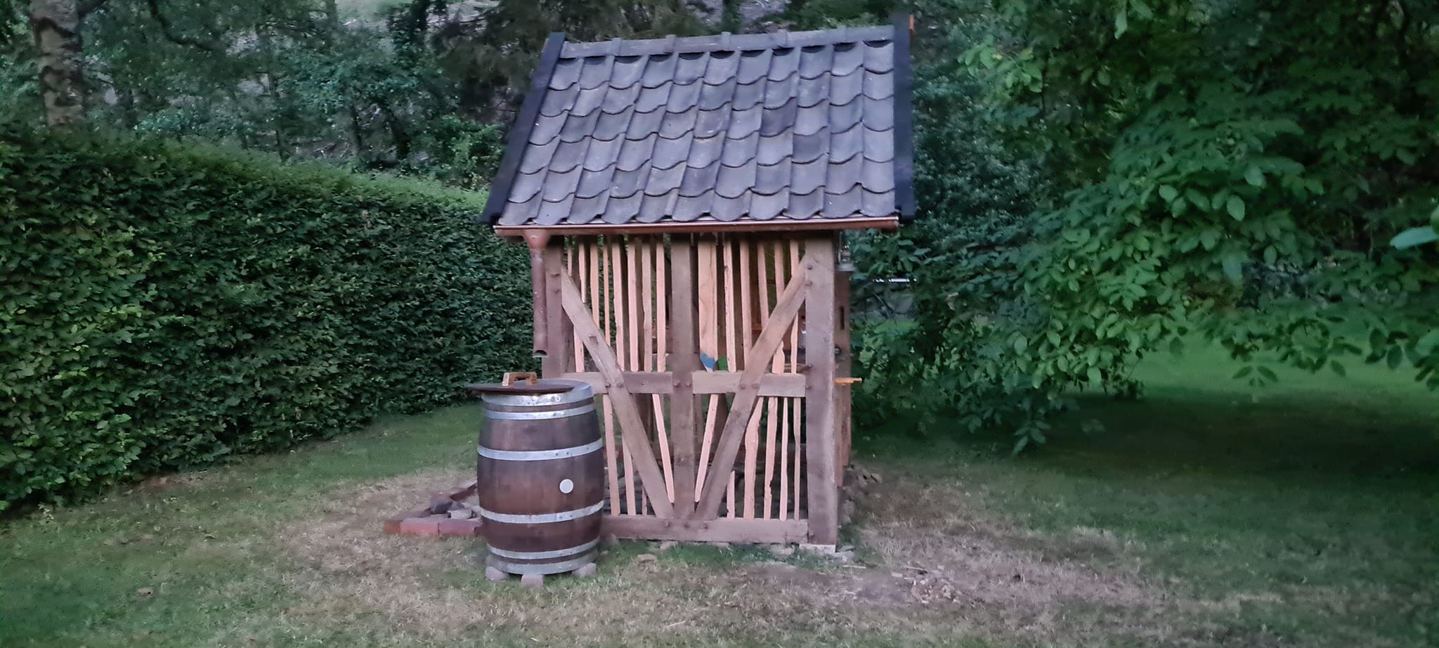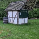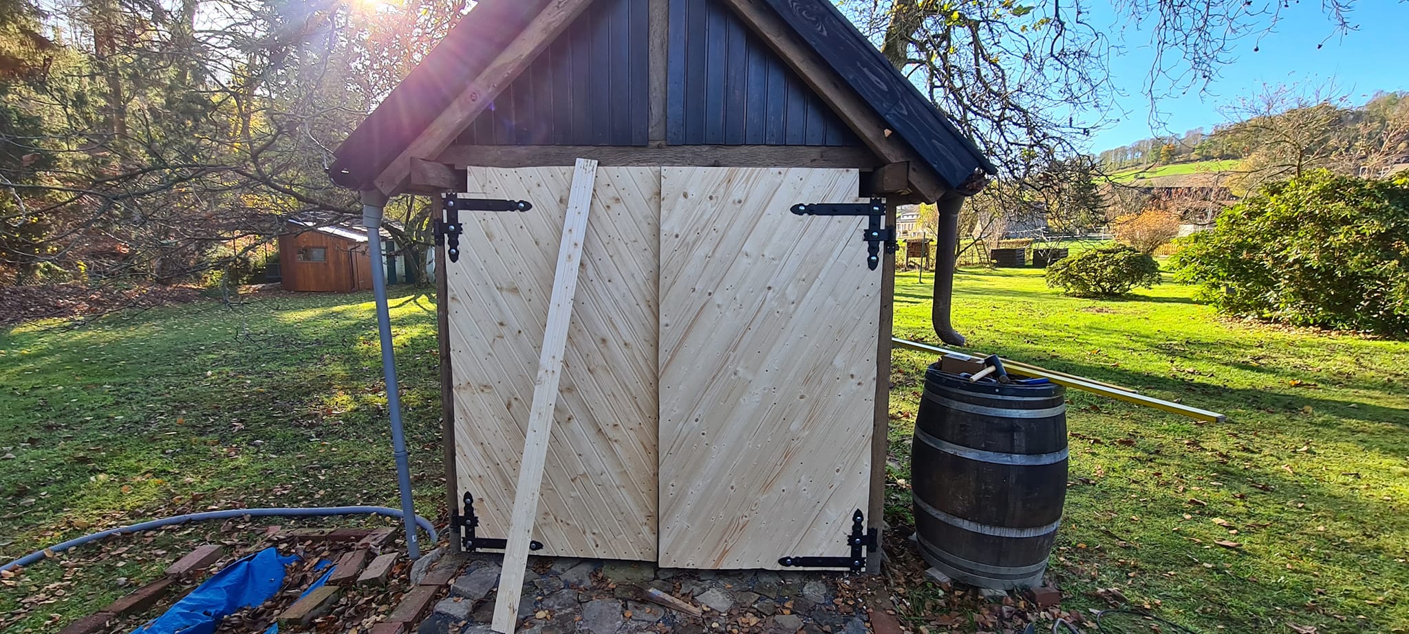 Der Bau der Schmiede war ein wahres Herzensprojekt, bei dem es auf jedes Detail ankam. Das alte Zunftwappen, das Aesopschlange, Zange, Hammer und Gold zeigt, wurde von Hand gemalt und verleiht der Schmiede einen traditionellen Charakter. Die Schlagläden und Türen, die im typischen Bergisch Grün lackiert wurden, runden das Gesamtbild ab.