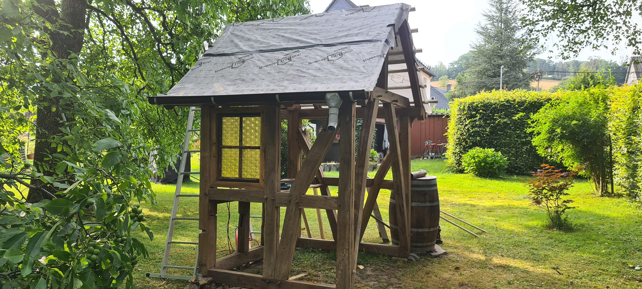 Das entscheidende Puzzleteil kam von einem Bekannten, der altes Handwerk auf Dorffesten vorgeführt hatte. Mit einem Eichenfachwerk und handgemachten Ziegeln im Gepäck war die Grundlage für die Schmiede gelegt. Stück für Stück nahm das Projekt Gestalt an, von den Punktfundamenten bis hin zur Abdichtung des Daches. Und wie es der Zufall so wollte, passte ein altes Butzenfenster perfekt in eine der Fachungen.